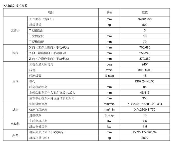 XA5032型立式升降臺銑床是改進(jìn)型通用產(chǎn)品。該產(chǎn)品操作方便,性能可靠,廣泛適用于各類機(jī)械加工部門,加工各種平面、溝槽、齒輪等配置萬能銑頭、圓工作臺、分度頭等銑床附件,可進(jìn)一步擴(kuò)大機(jī)床使用范圍